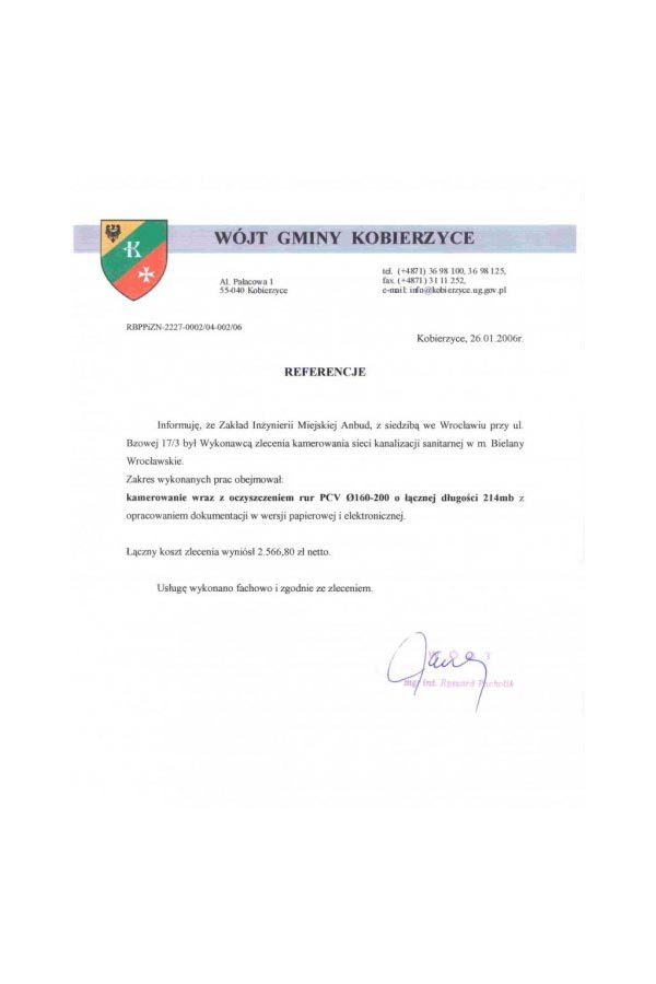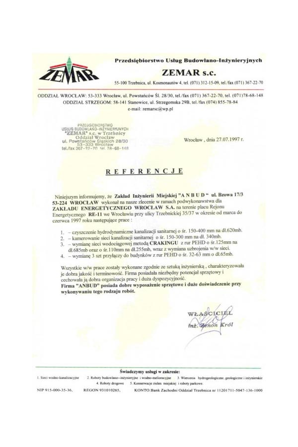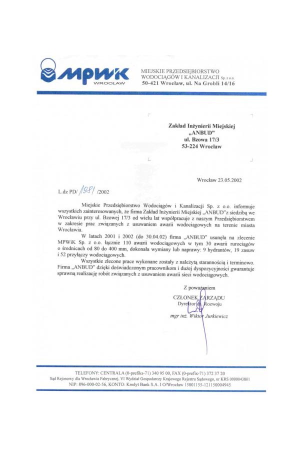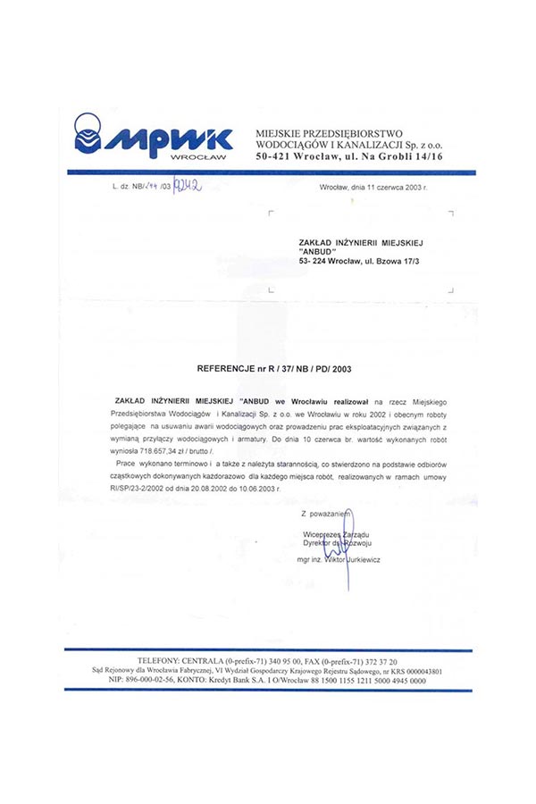 Przez 10 lat tj. do 2004 roku świadczone były również na rzecz MPWiK Wrocław Sp. z o. o usługi w zakresie usuwania awarii na sieciach wodociągowych i kanalizacji sanitarnej. Czyszczenia hydrodynamiczne, przeciski pneumatyczne, budowa przyłączy wod-kan, usuwanie awarii na sieciach wod-kan to uzupełnienie bieżącej działalności w świadczeniu usług.